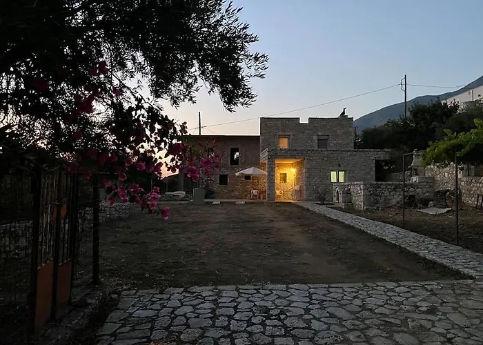 Guests can enjoy a seaside sea view from a terrace at Potis Stone House Villa Akia, 10 minutes' drive from Glyfada Cave.
